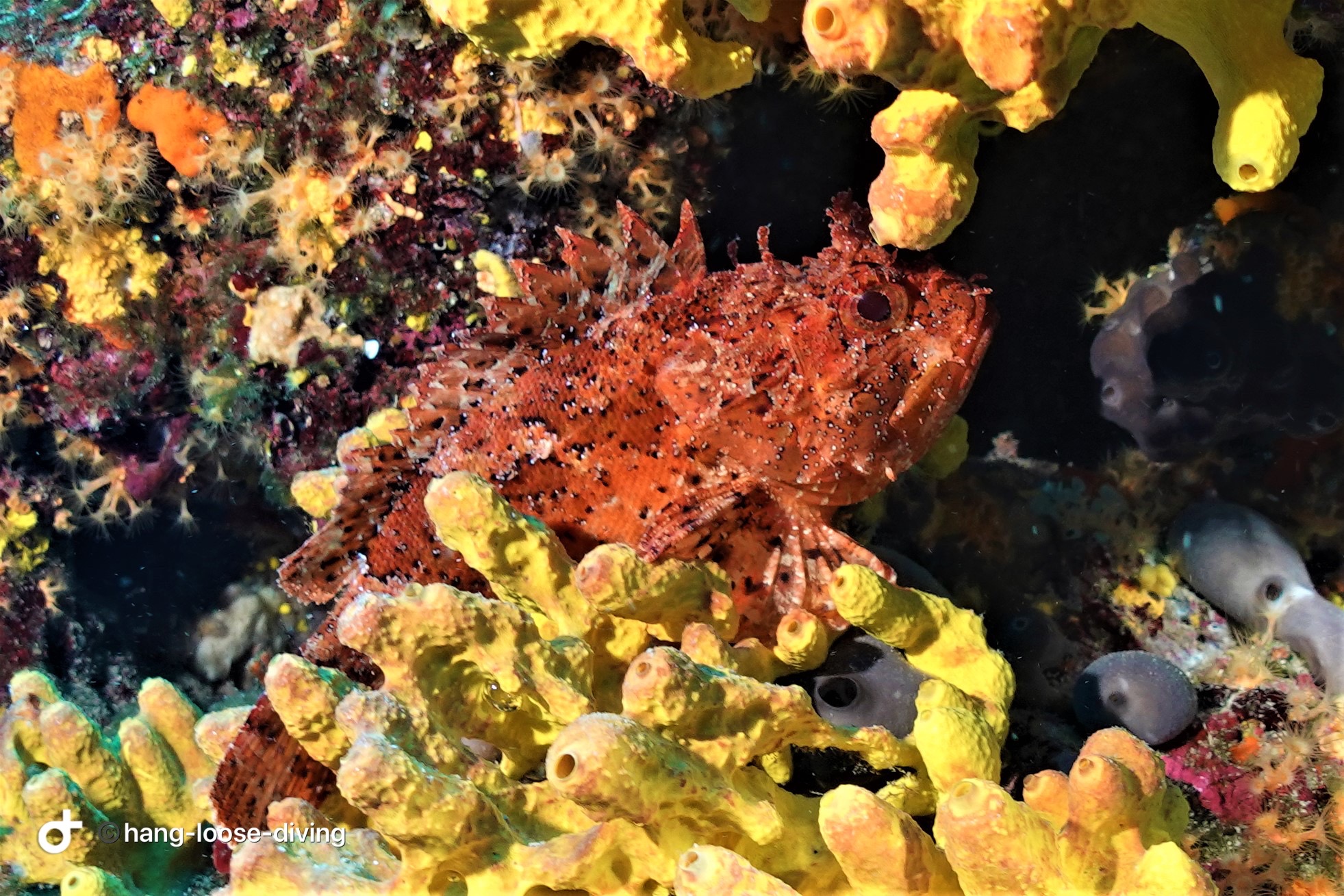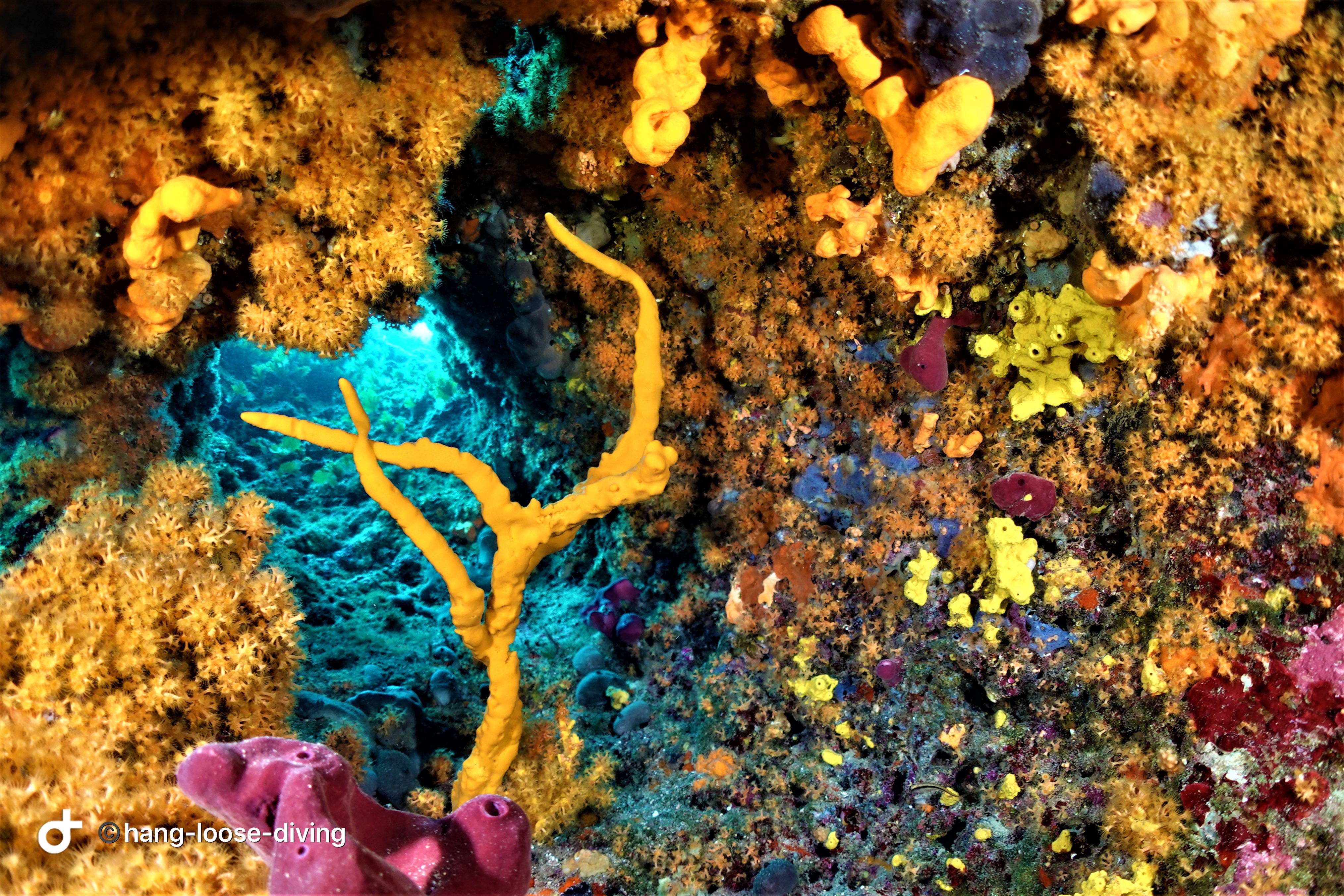 Wir folgen aber der Riff-Formation weiter mit Riff an linker Schulter Richtung Norden, bis wir im 10 Meter Bereich einen großen Felsen auf einer Sandfläche liegen sehen. Dahinter verbirgt sich der Eingang zu einer großen Grotte, in die bequem 4 Taucher eintauchen können. Die Grotte zieht sich ca. 30 Meter ins Innere der Insel Cres und ist speziell am Eingang wunderschön in allen Farben bewachsen. Achtung: bitte auf Tarierung achten, da sonst nachkommende Taucher nichts mehr sehen… ;-)