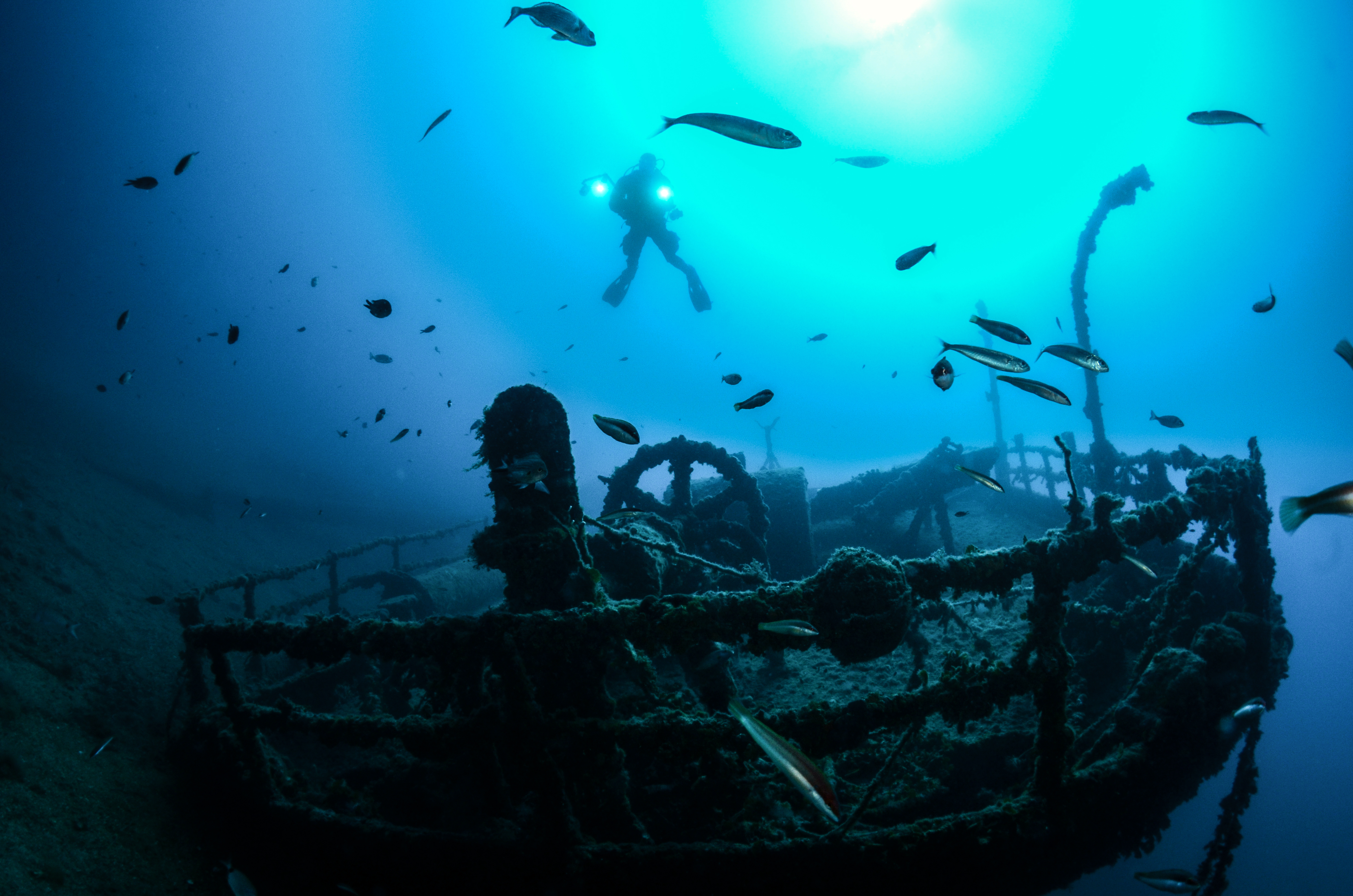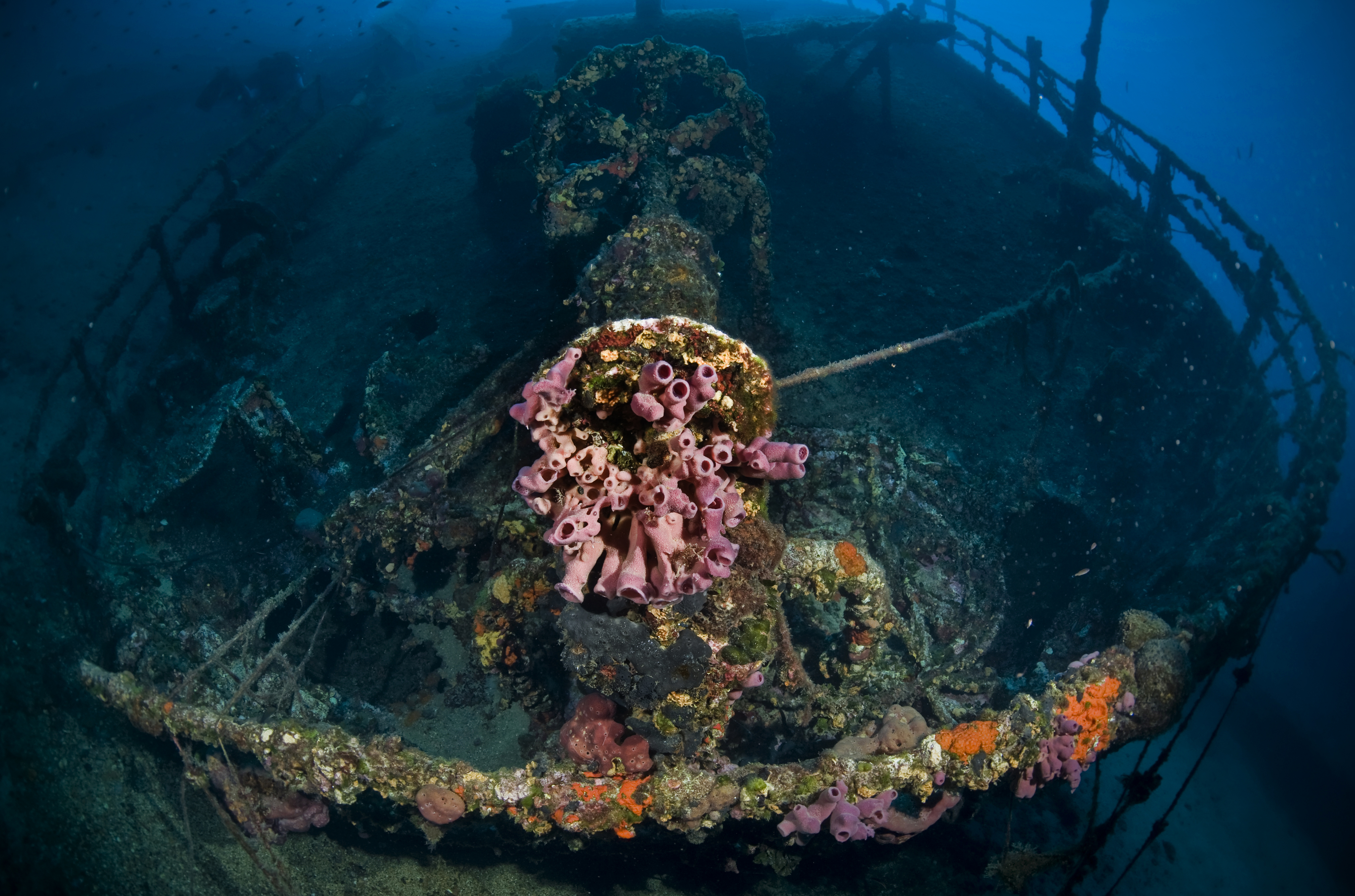 Das in allen Regenbogenfarben schimmernde Steuerrad und die Reling sind begehrte Fotomotive. Das Wrack ist mit Schwämmen und Weichkorallen überzogen.