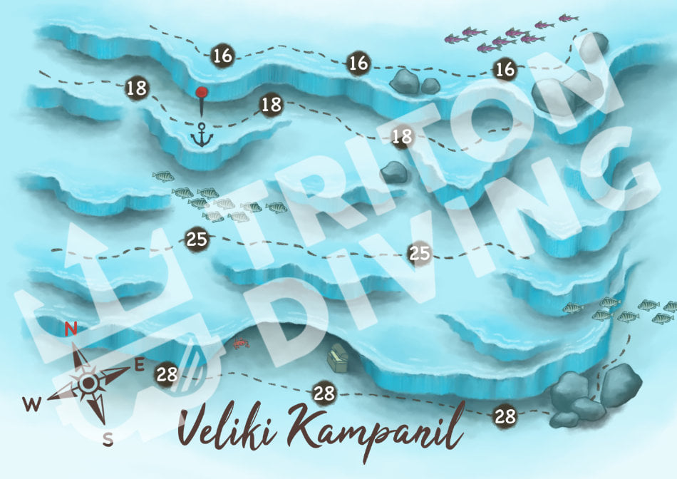 Die Große Kampanile befindet sich ca. 1,8Nm westlich von Vrsar direkt auf dem Weg zum Wrack Coriolanus. Das Riff beginnt mit einem Plateau auf ca. 18m und fällt nördlich recht steil bis 28m ab. Wenn man die Wand Richtung Osten taucht kommt man an einen Winkel, an dem diese nach Süden dreht und nochmal bis auf ca. 40m abfällt. Wunderschön bewachsen mit Krustenanemonen und allerlei Plattwürmer, Schnecken und Krebsgetier.