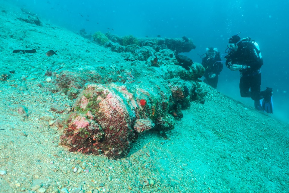 Es sind 14 teils verwachsene, ansonsten gut erhaltene Kanonen die sich in Blöcken am schräg abfallenden Meeresgrund in 34 Meter Tiefe stapeln.