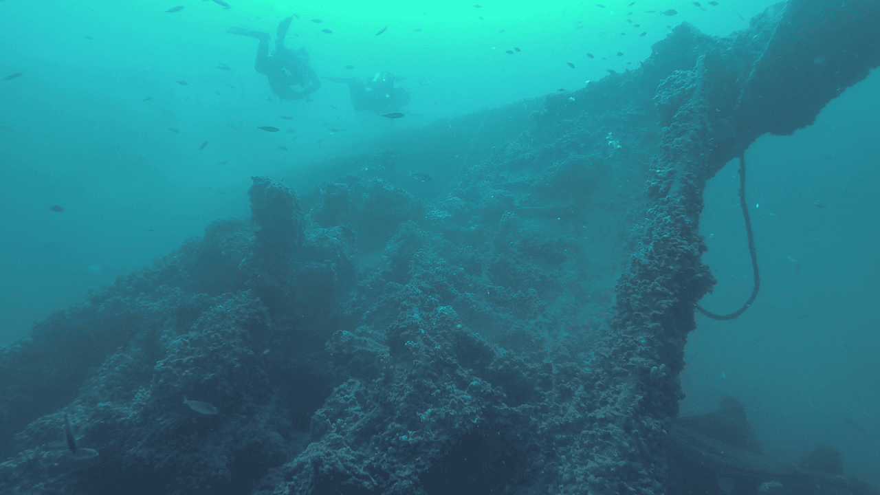 Je nach Sicht kann man das Wrack bereits ab einer Tauchtiefe von ca. 20 Metern schemenhaft erblicken. Nun steht es in einer Tiefe von 49 Meter aufrecht am sandigen Meeresgrund.