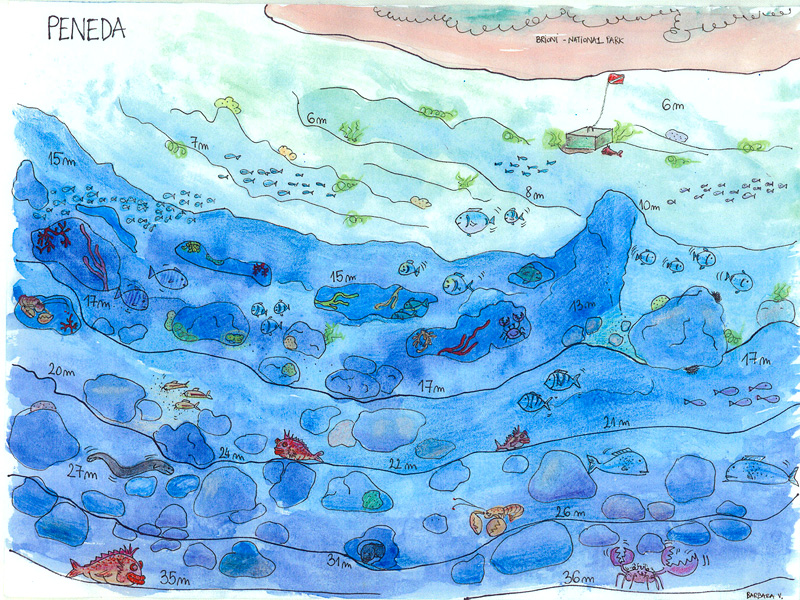 Nach 15 min. Anfahrt mit dem Tauchboot vom Diving Center Puntizela aus, wird der Startplatz, eine Boje am Riffdach auf Höhe des Leuchtturmes am Kap Peneda erreicht, wo der geführte Tauchgang in südliche Richtung startet.