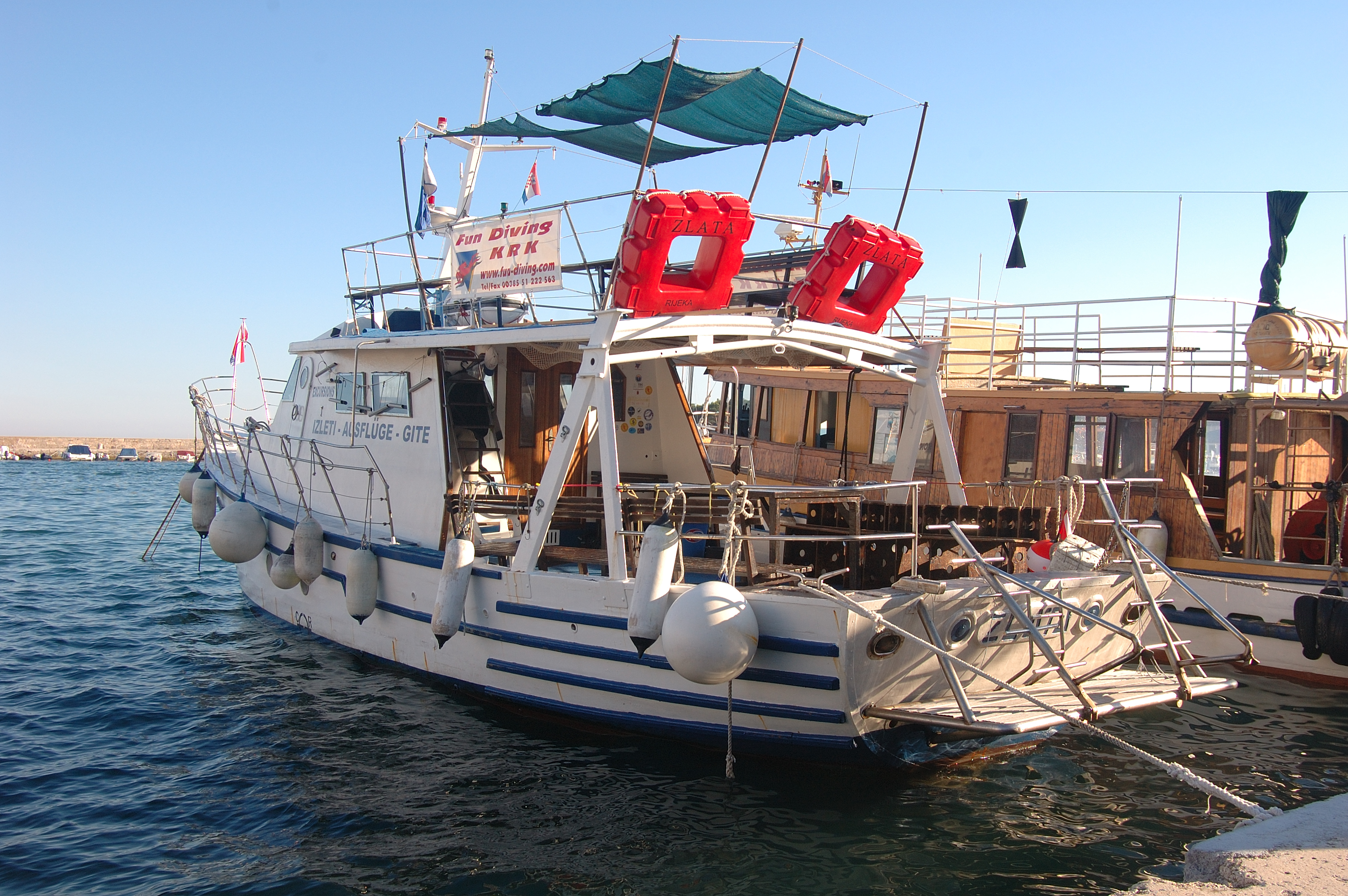 Tauchausfahrten: Für Tauchausfahrten stehen den Tauchern bis zu drei Tauchboote für ca 20 Personen pro Boot zur Verfügung. Jeden Morgen starten die Tauchboote um Taucher zu den schönsten Tauchplätzen rund um die Insel Krk sowie zu den Tauchplätzen der Insel Plavnik und Cres zu bringen. Eine Tagestour beinhaltet zwei Tauchgänge an vorher abgesprochenen Top Tauch-Spots. Luft und Blei sind inkludiert. Es besteht auch die Möglichkeit, an Bord zu essen. Es werden auch einzelne Tauchausfahrten zu verschiedenen Wracks, sowie Landtauchgänge nach Absprache angeboten.