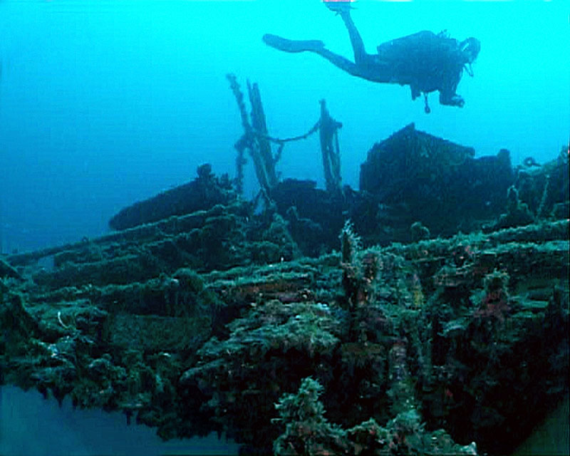 Das Abtauchen mit Sicht zur nahen Riffkante geschieht im freien Sinkflug. Schon nach wenigen Metern erscheinen im tiefblauen Wasser die dunklen Umrisse des Wracks. Die fehlenden hölzernen Schiffsplanken geben diesem seinen übriggebliebenen Spanten ein gespenstiges Aussehen. Der Verfall des Wracks geht recht schnell vor sich. Wo noch vor wenigen Jahren die Aufbauten bis in eine Höhe von 25 Meter aufragten sind diese jetzt fast gänzlich verschwunden. Große Sägebarsche und Drachenköpfe bevölkern das Wrack.