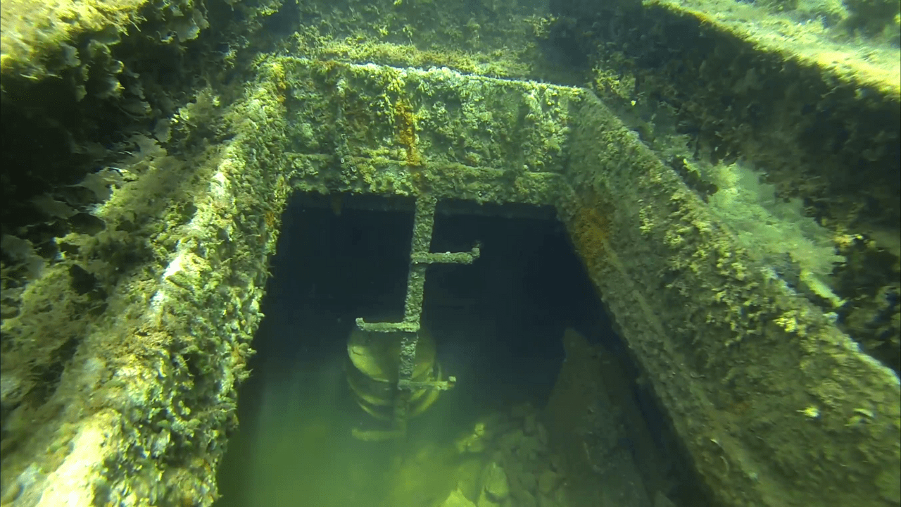 Die nach der Bombardierung ausgebrannten Überreste der Siebelfähre können auch von Schnorchlern betaucht werden. Man sieht Mittschiffs die Überreste der Besatzungsquartiere und das Ruderhaus.