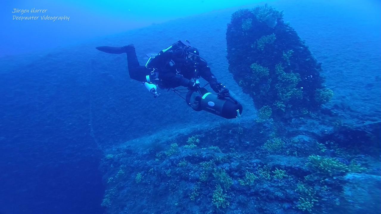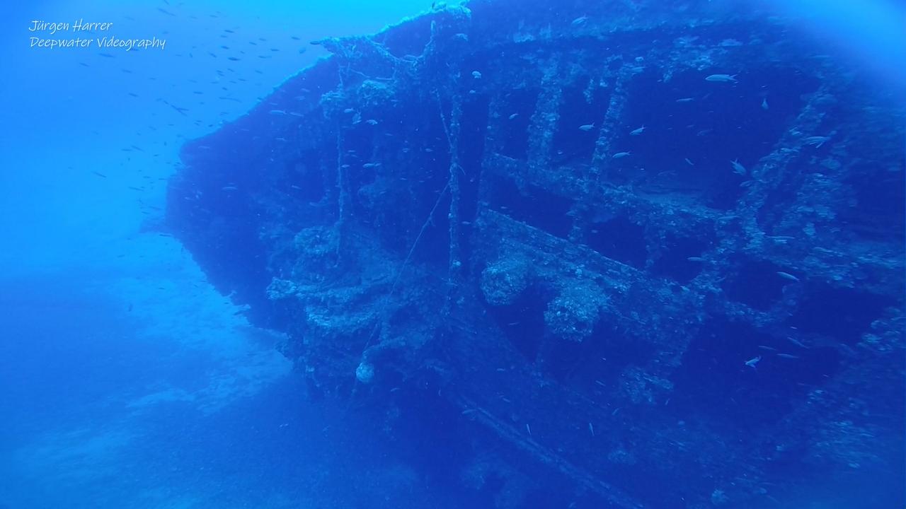 Vorbei am mächtigen Schornstein ragt vor dem Heck der zweite Mast aus dem Wrack heraus. Ich tauche unter das Heck und bestaune das Ruderblatt und die Schiffsschraube, die wunderschön mit gelben Schwämmen bewachsen sind. Aber Achtung: Man sollte öfter einen Blick auf den Tiefenmesser machen, liegt doch das Heck auf einer Tiefe von über 50m, und damit aus dem Sporttauchbereich. Aufgrund der guten Sicht ist man sich der Tiefe eigentlich gar nicht bewusst.