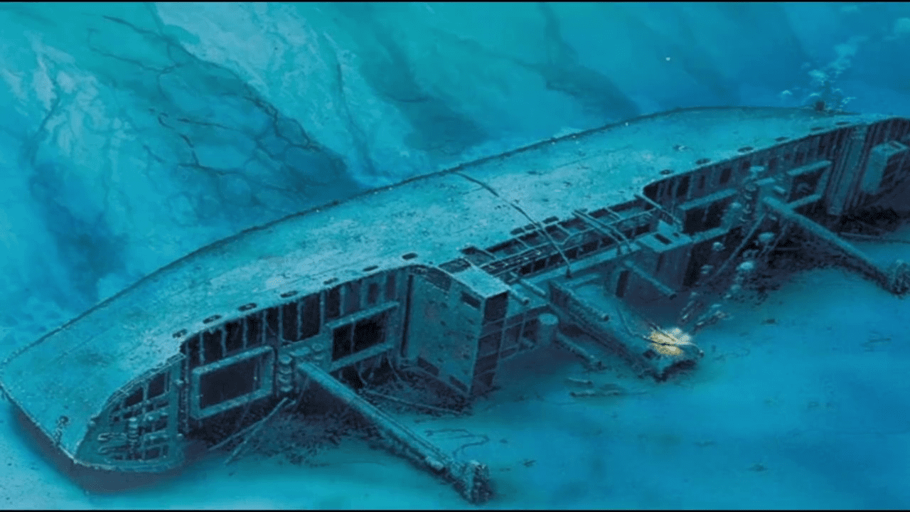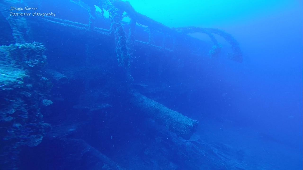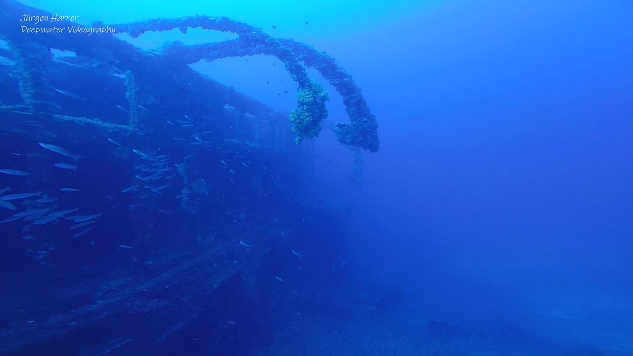 Am Bug befindet sich noch immer die Ankerwinde des Schiffes, das sich auf seine Backbordseite gelegt hat. Etwas weiter sehe ich eine riesige Ladeluke die in einen Frachtraum führt. Im Inneren befinden sich noch Reste der Kohlefracht. An einer Wand lehnt eine Ersatzschraube. Ich tauche an einem der beiden Masten vorbei und sehe über mir die Davits der Rettungsboote.