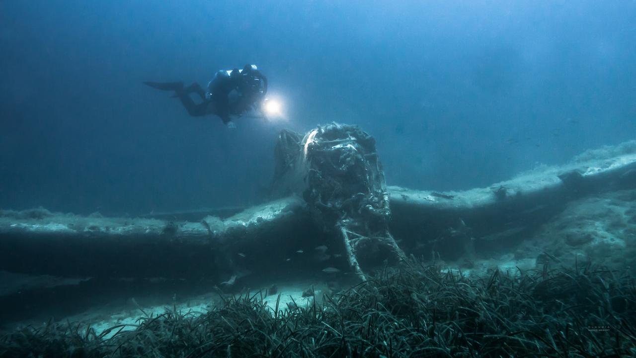 Die Tauchtiefe beträgt ca. 28 m. Der Stuka Bomber steht auf sandigem Untergrund im Poseidongras. Der Motor ist mittlerweile zum Wrack transportiert worden und liegt nur ein paar Meter entfernt. Beim abtauchen ist die JU87 schon ab etwa 10 m Tiefe deutlich zu erkennen.