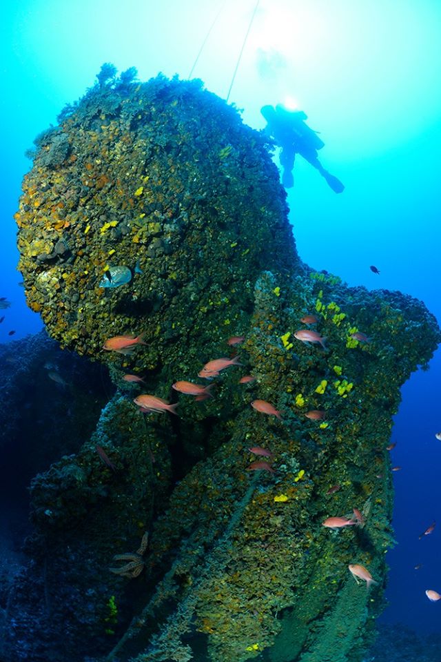 Die zwei großen Schiffsschrauben sowie die Ruder sind die ersten Teile auf die man nach dem Abtauchen in der Tiefe von 45 Meter trifft. Wie zerrissene Vorhänge einer großen Halle sind zwischen den Rudern die Überreste von Fischernetzen, die sich im Laufe der Zeit im Wrack verfangen haben, gespannt.